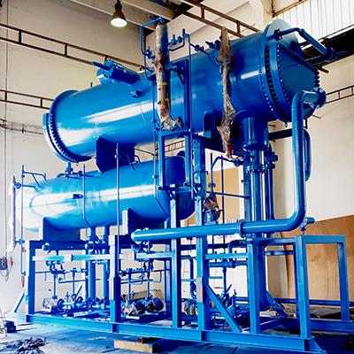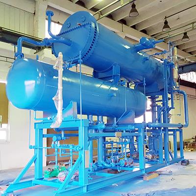 Flux-Hi™ NH3/CO2 Kaskade montiert auf einem CO2 Behälter. Die NH3 undCO2 Pumpen sind auf einem kompakten Stahlrahmen montiert. DIe Montage aller benötigten Instrumente, Verrohrungen und Sensoren runden diese Baugruppe ab.